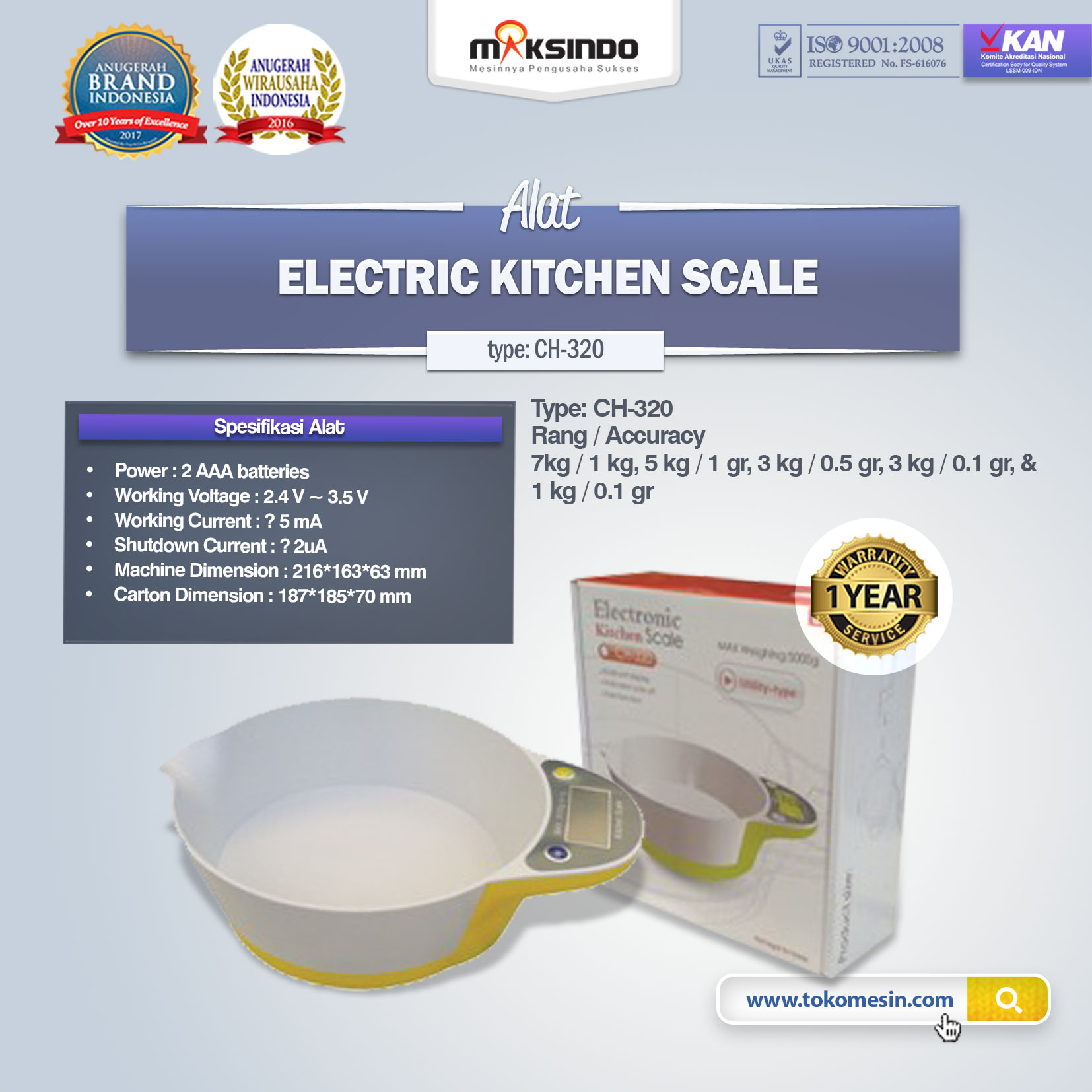 Electric Kitchen Scale merupakan timbangan digital dari Maksindo yang berfungsi untuk menimbang bahan makanan dalam kapasitas kecil. Anda dapat mengimplikasikan timbangan ini untuk kebutuhan usaha seperti usaha : bakery, restoran, cafe dll. Timbangan ini memiliki bentuk yang sangat unik dan dijual dengan harga yang sangat terjangkau.