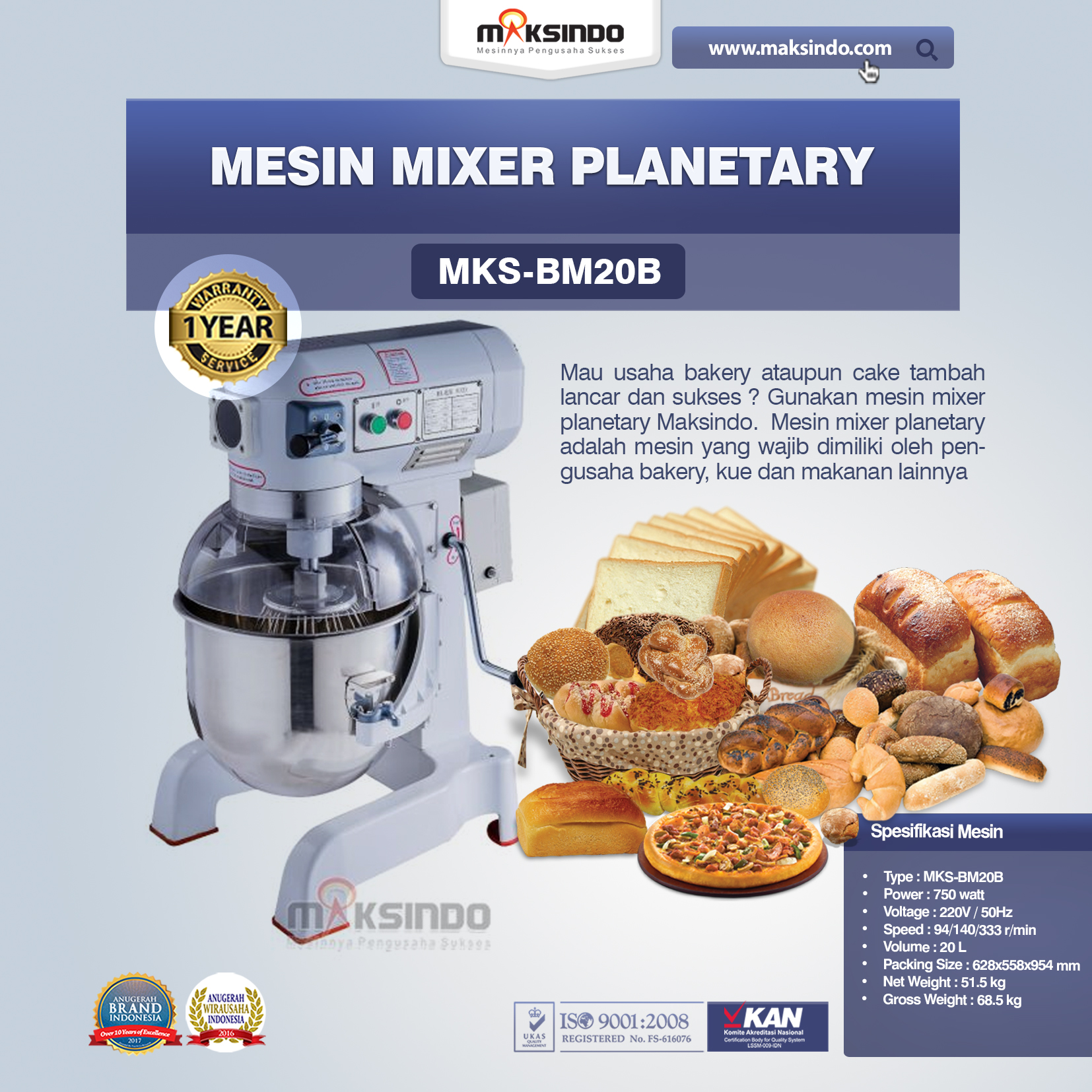 Bisnis bakery menjadi salah satu pilihan bisnis yang menjanjikan untuk dijalani, terlebih kue dan roti yang sangat diminati oleh aneka kalangan usia. Sehingga banyak pebisnis bakery yang menerjuni usaha ini. Apabila Anda tertarik untuk mengawali bisnis bakery ini maka salah satu cara agar bisa berhasil dalam menjalani usaha yakni dengan menggunakan mesin usaha yang sesuai. Seperti mesin mixer planetary yang bisa membantu pengadukan adonan dengan merata dan cepat. Tentunya pekerjaan membuat aneka jenis kue akan semakin gampang dan sederhana. Buat mempermudah para pengusaha bakery di Indonesia Maksindo menawarkan mesin mixer planetary tipe MKS-BM20B. Tampilan mesin elegan akan mempercantik dapur bisnis Anda.