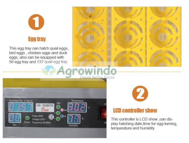 - Kapasitas : ayam (96 telur), bebek (48 telur), Burung (192 telur), angsa (48 telur)