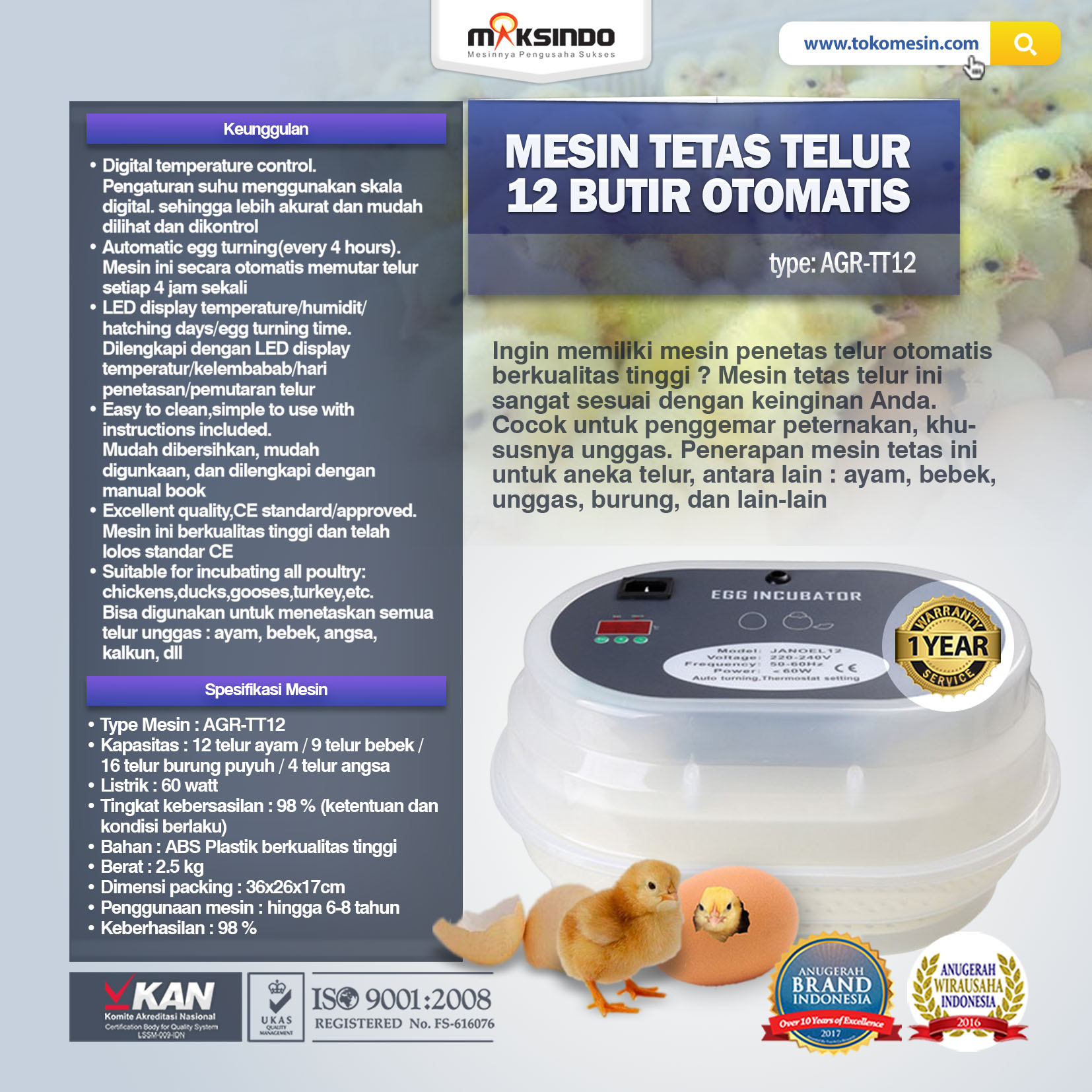 Spesifikasi Mesin Penetas Telur 12 Butir Agrowindo