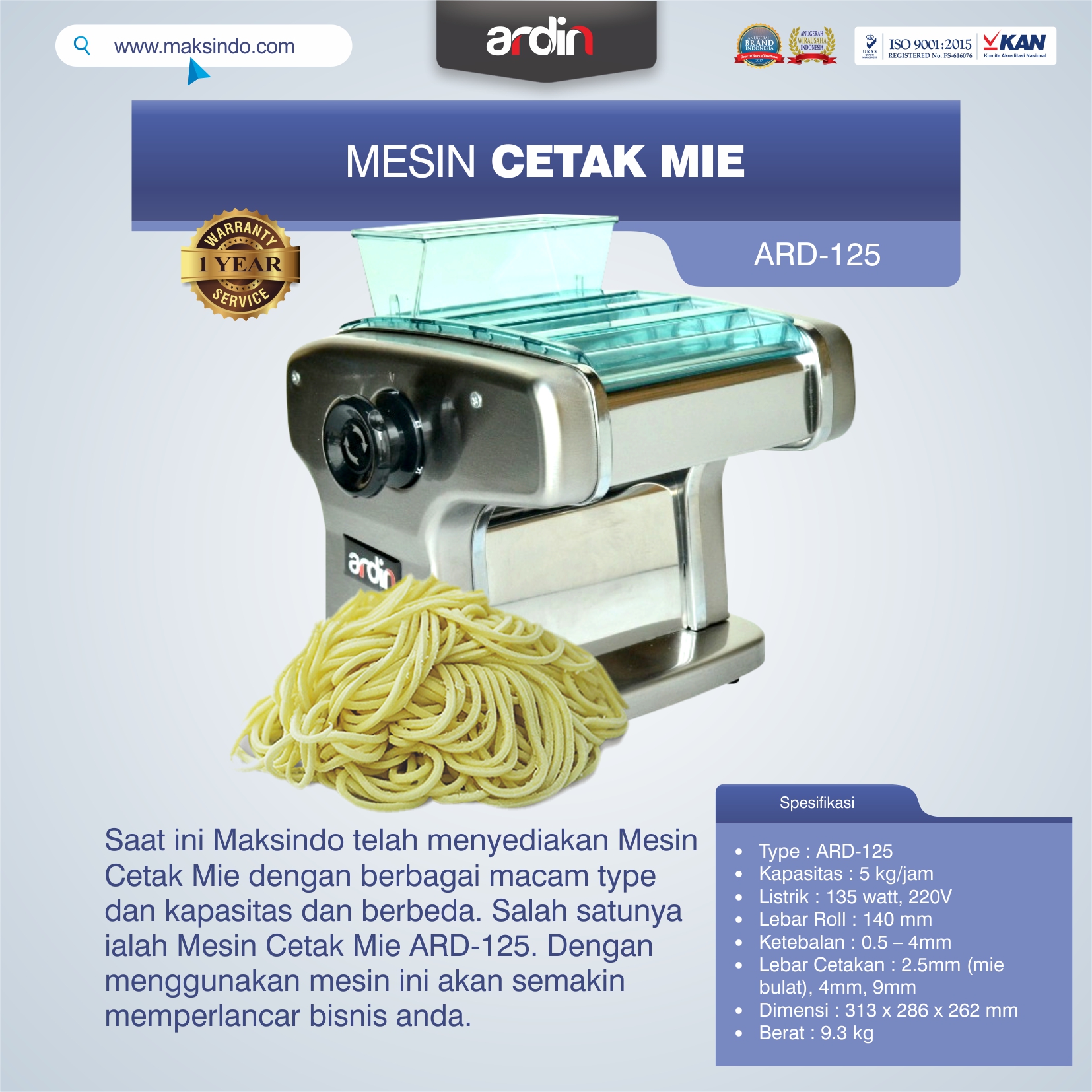 Ingin terjun dalam bisnis kuliner mie tapi belum memiliki mesin usaha. Jangan binggung kini Toko Mesin Maksindo telah menghadirkan Mesin Cetak Mie ARD-125 yang akan membantu Anda dalam melancarkan proses mencetak mie.