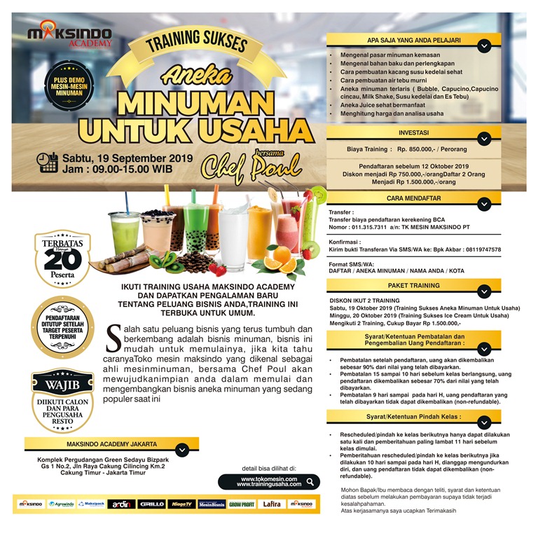 Ikuti Training Usaha Maksindo Academy dan Dapatkan Pengalaman Baru, Teman Baru Tentang Peluang Bisnis Anda,Training ini terbuka untuk umum. Salah satu peluang bisnis yang terus tumbuh dan berkembang adalah bisnis minuman, bisnis ini mudah untuk memulainya, jika kita tahu caranya Toko mesin maksindo yang dikenal sebagai ahli mesin minuman, bersama Chef Poul akan mewujudkan impian anda dalam memulai dan mengembangkan bisnis aneka minuman yang sedang populer saat ini.