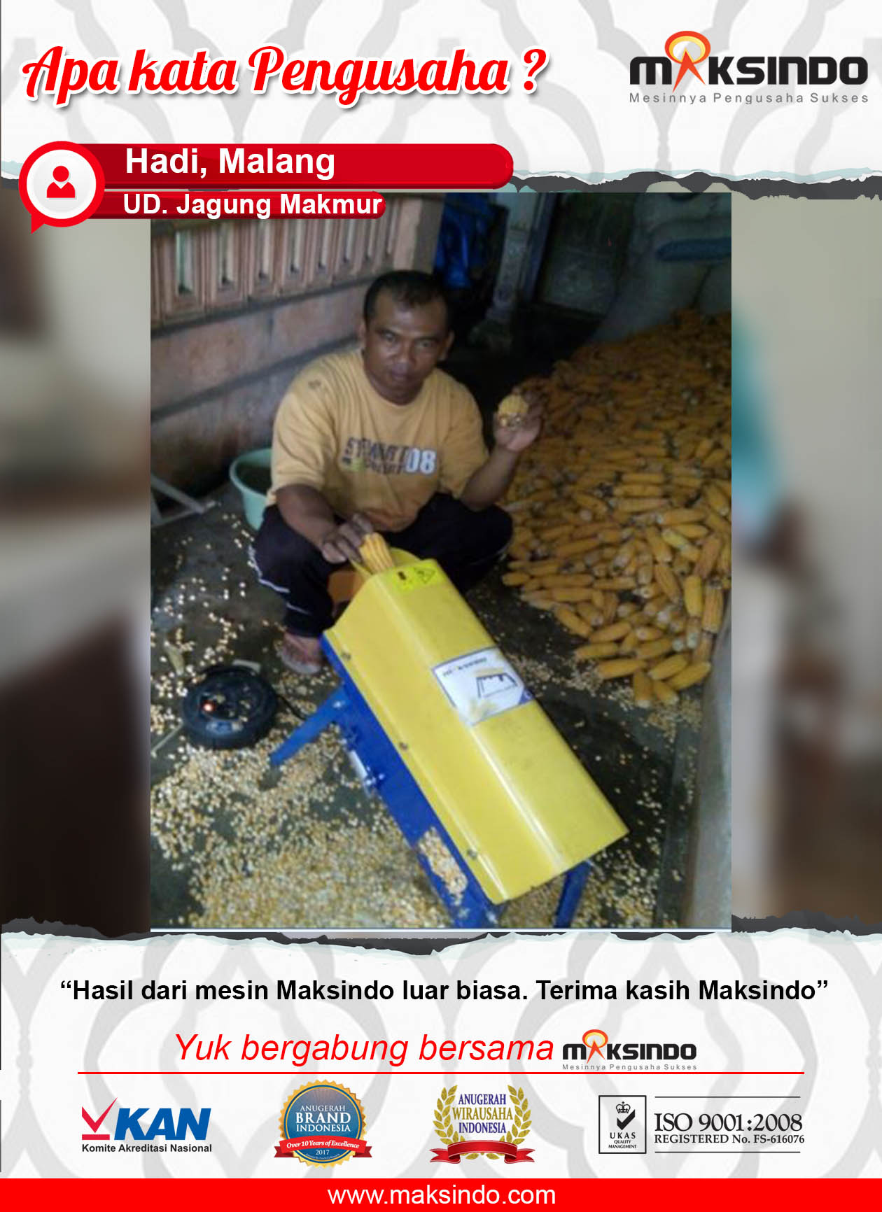 UD Jagung Makmur merupakan salah satu kelompok tani yang ada di Kota Malang. Untuk memudahkan waktu panen jagung terutama pada saat proses pemipilan jagung Hadi selaku pengelola organisasi tersebut memilih menggunakan mesin pemipil jagung dari Maksindo.